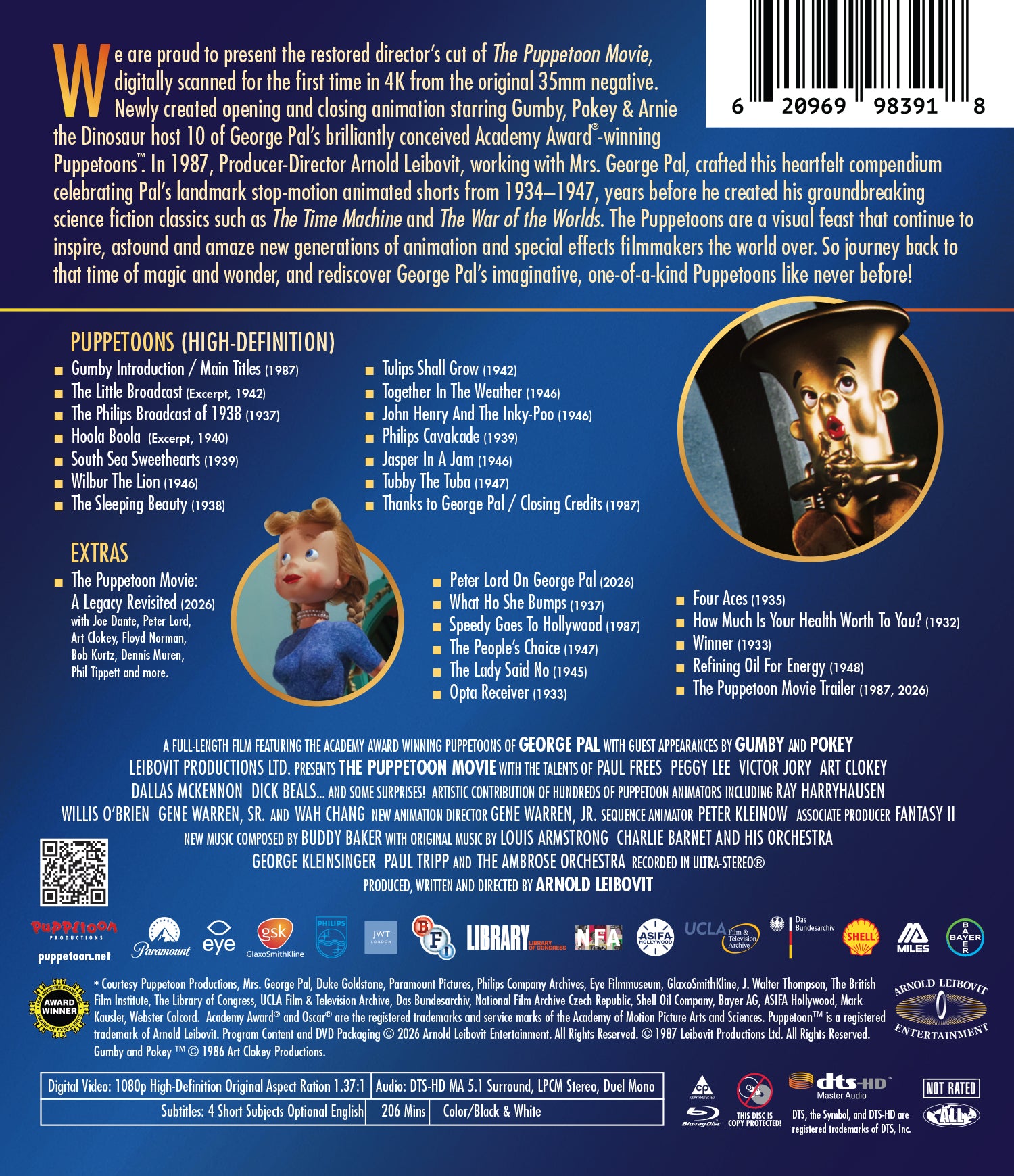 Courtesy Puppetoon Productions, Mrs. George Pal, Duke Goldstone, Paramount Pictures, Philips Company Archives, Eye Filmmuseum, GlaxoSmithKline, J. Walter Thompson, The British Film Institute, The Library of Congress, UCLA Film & Television Archive, Das Bundesarchiv, National Film Archive Czech Republic, Shell Oil Company, Bayer AG, ASIFA Hollywood, Mark Kausler, Webster Colcord. Academy Award® and Oscar® are the registered trademarks and service marks of the Academy of Motion Picture Arts and Sciences. Puppetoon™ is a registered trademark of Arnold Leibovit. Program Content and DVD Packaging © 2026 Arnold Leibovit Entertainment. All Rights Reserved. ©1987 Leibovit Productions Ltd. All Rights Reserved. ™1986 Art Clokey Productions